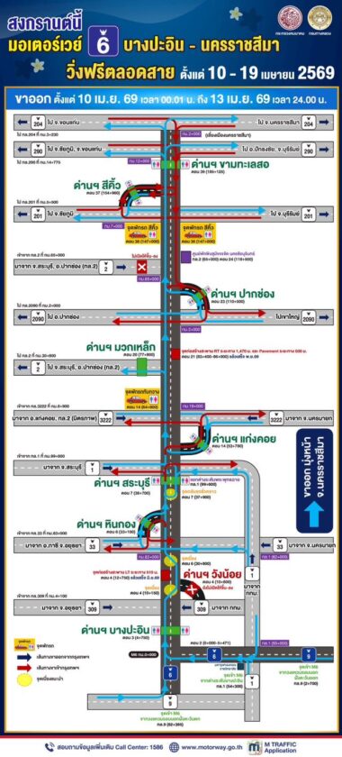 กรมทางหลวง เตรียมความพร้อมเปิดทดลองให้บริการมอเตอร์เวย์ M6 สายบางปะอิน – นครราชสีมา ตลอดสาย ตั้งแต่บางปะอิน – ปากช่อง – นครราชสีมา ระยะทางรวม 196 กิโลเมตร ระหว่างวันที่ 10 – 19 เมษายน 2569 (จำนวน 10 วัน) เพื่อรองรับปริมาณการเดินทางของประชาชน ลดความแออัดบนถนนมิตรภาพ และถนนพหลโยธิน เพิ่มความสะดวกในการเดินทางสู่ภาคตะวันออกเฉียงเหนือ