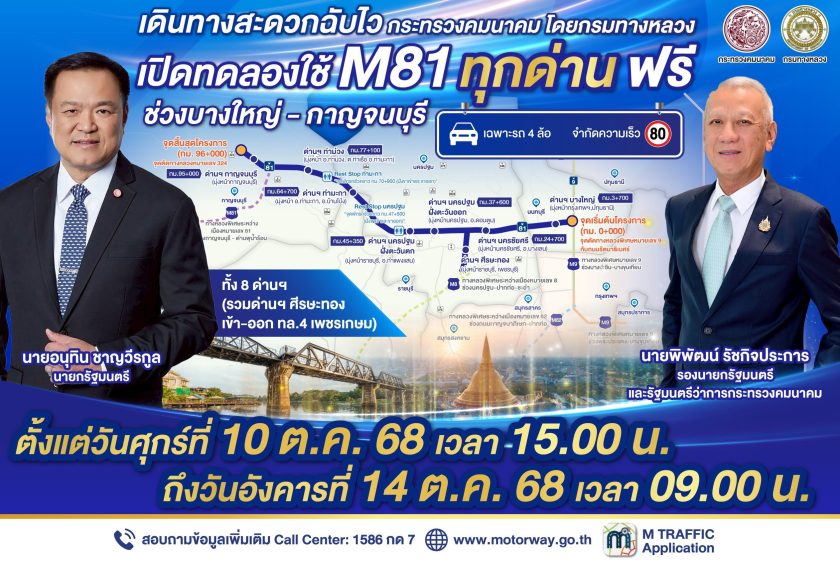 (8 ตุลาคม 2568) กรมทางหลวง ขานรับนโยบายเร่งด่วนของกระทรวงคมนาคม ภายใต้การกำกับดูแลของ นายพิพัฒน์ รัชกิจประการ รองนายกรัฐมนตรีและรัฐมนตรีว่าการกระทรวงคมนาคม ที่มุ่งยกระดับโครงข่ายคมนาคมของประเทศให้มีความสะดวก ปลอดภัย และช่วยลดภาระค่าใช้จ่ายในการเดินทางของประชาชน ประกาศเปิดทดลองให้บริการทางหลวงพิเศษระหว่างเมืองหมายเลข 81 สายบางใหญ่ – กาญจนบุรี (มอเตอร์เวย์ M81) ตลอดสาย ระยะทาง 96 กิโลเมตร โดยไม่เก็บค่าธรรมเนียมผ่านทาง ระหว่างวันศุกร์ที่ 10 ตุลาคม 2568 เวลา 15.00 น. ถึง วันอังคารที่ 14 ตุลาคม 2568 เวลา 09.00 น. เพื่ออำนวยความสะดวกการเดินทางช่วงวันหยุดยาวเนื่องในวันนวมินทรมหาราช